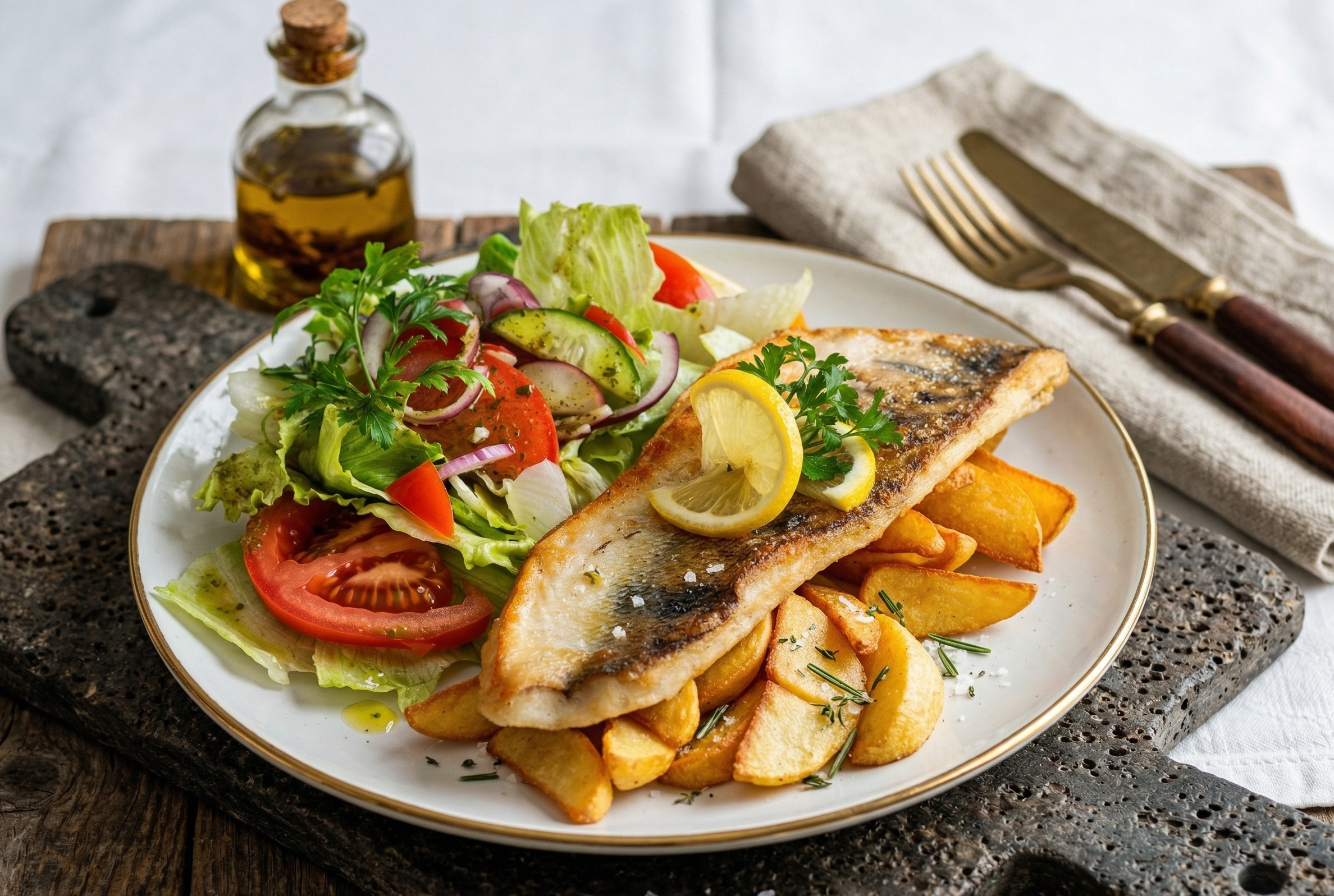 z frytkami i sałatami oraz sosem czosnkowym